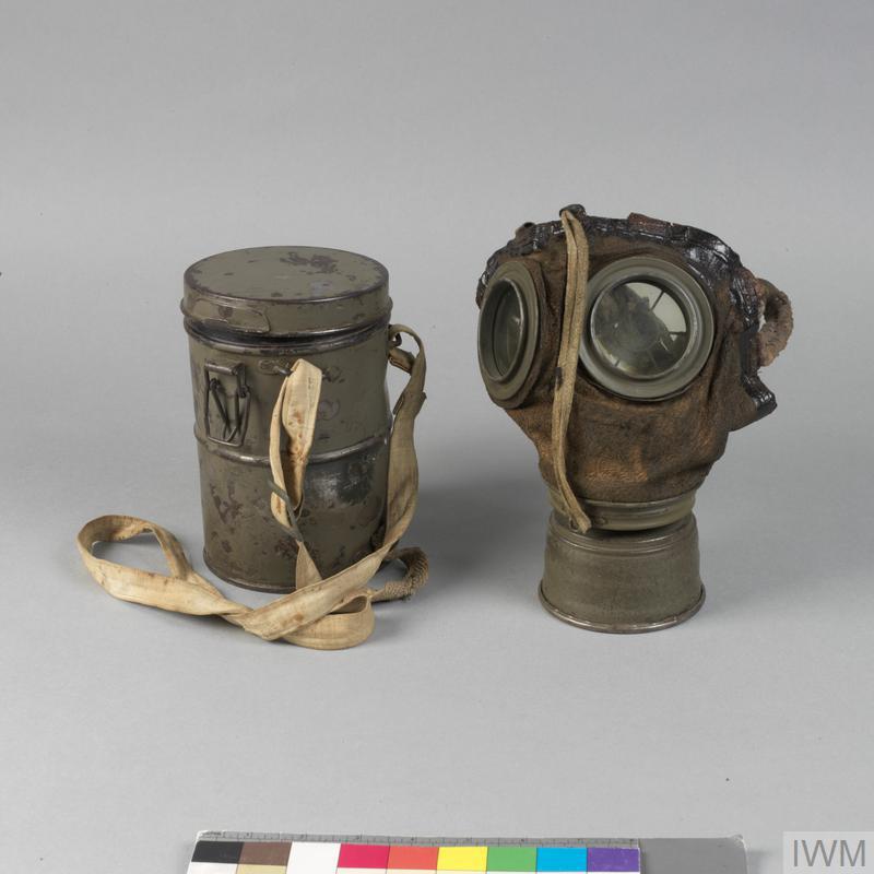Respirator, anti-gas, M1917 Lederschutzmaske & Container: German (EQU 3918) Respirator comprising leather face mask with fitted mica eyepieces mounted in circular metal frames. The mask has an elasticated head harness and is fitted with detachable metal filter. Copyright: © IWM. Original Source: http://www.iwm.org.uk/collections/item/object/30015959