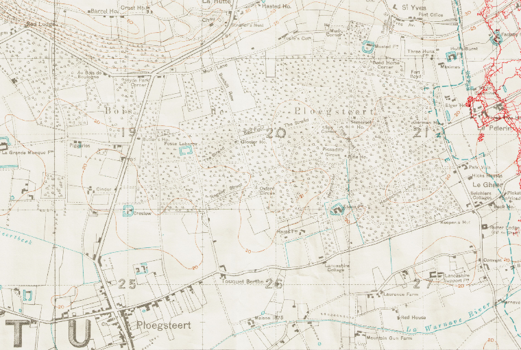 - Ploegsteert, située à l’ouest de Comines, près de la frontière d’Armentières, resta sous contrôle britannique jusqu’au 12 avril 1918, sauf pour quelques jours au début des combats de 1914 où elle fut occupée par les Allemands. Les Britanniques reprirent la ville à la fin de septembre, lors de l’offensive libératrice.
